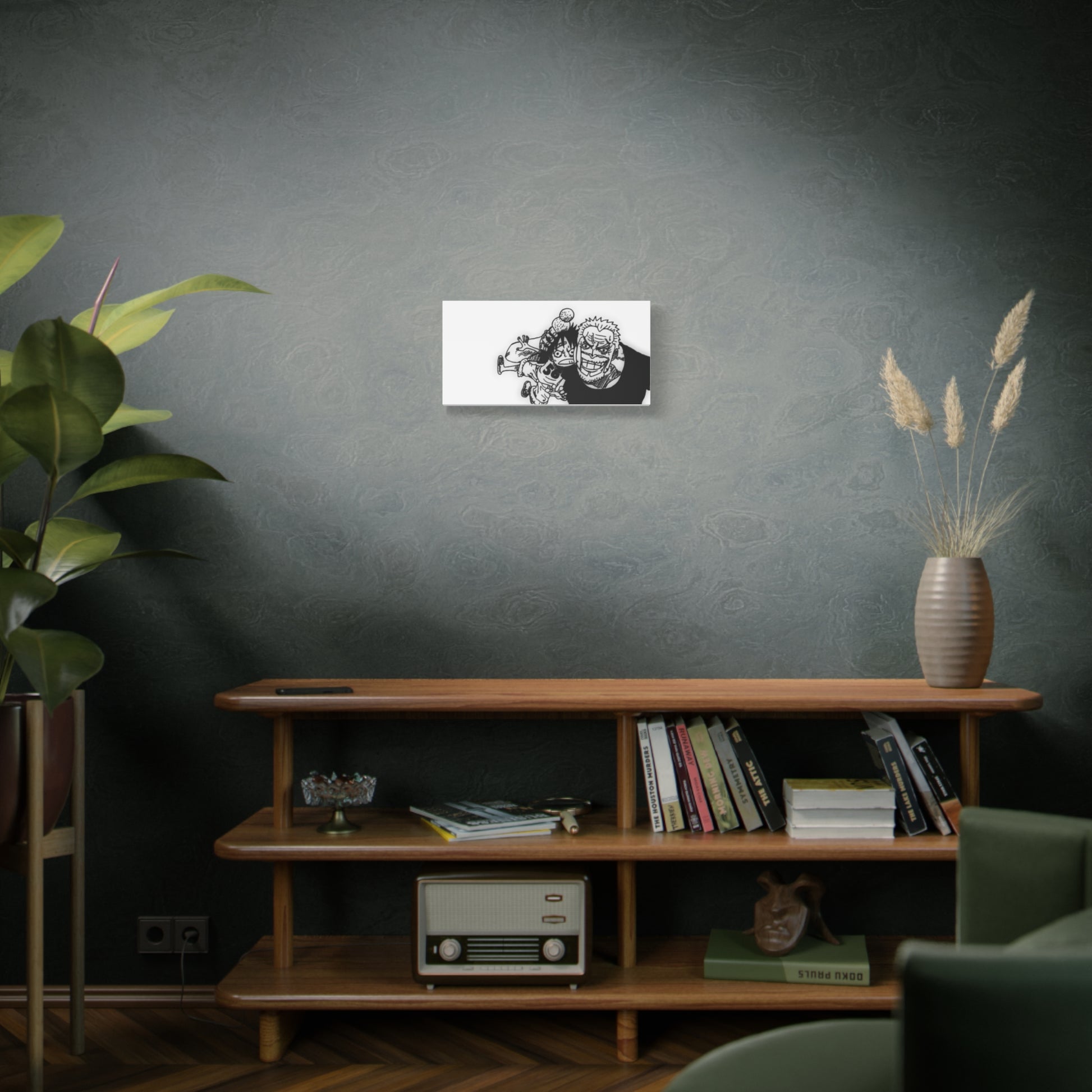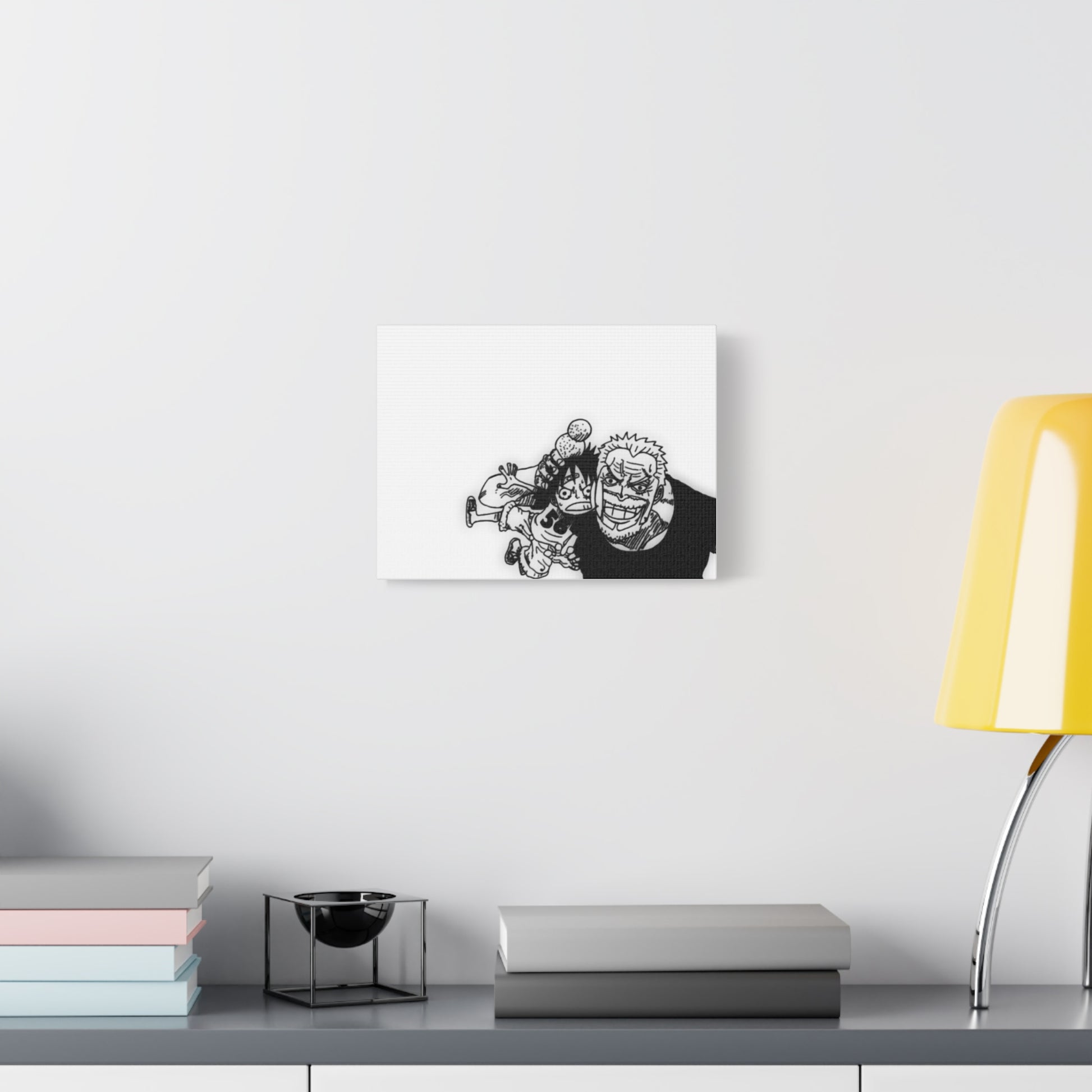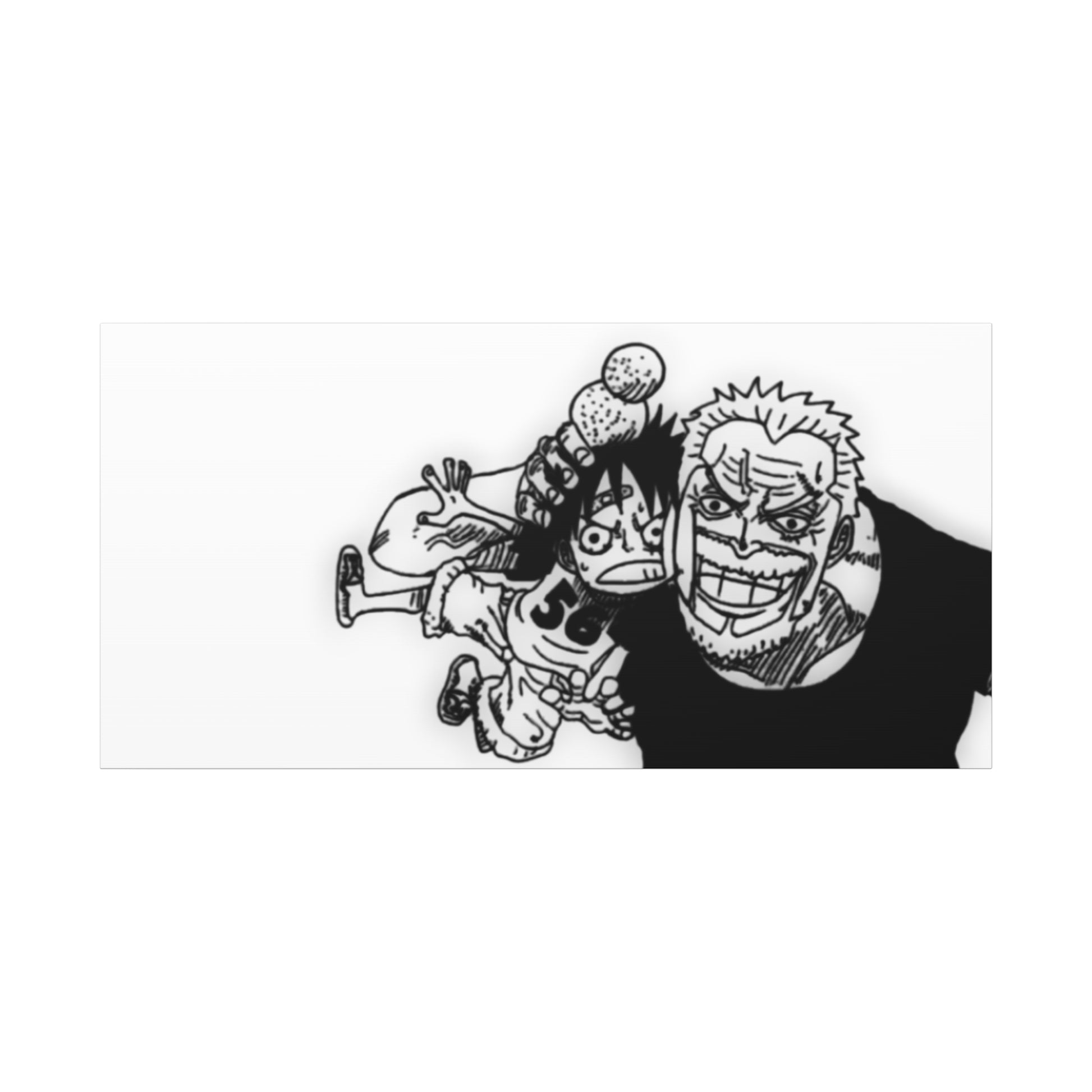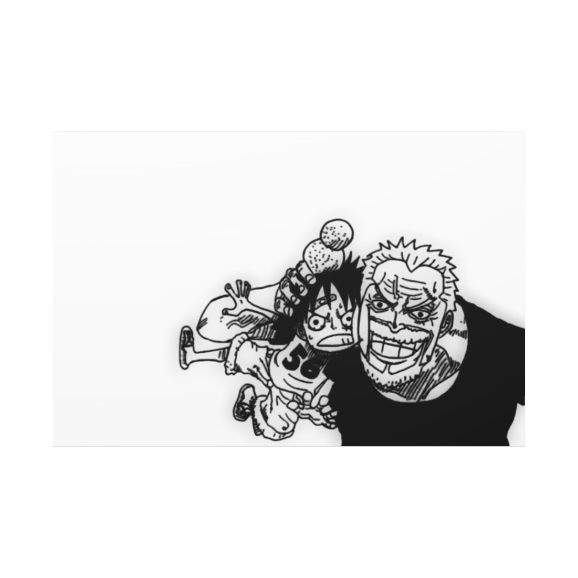 This framed canvas captures one of anime's most touching family moments: the veteran admiral cradling his baby grandson with surprising gentleness—rough hands that have seen countless battles now holding the next generation with pure love. The black and white illustration emphasizes the emotional contrast—strength meeting innocence, duty meeting family, a warrior's hands protecting the future.